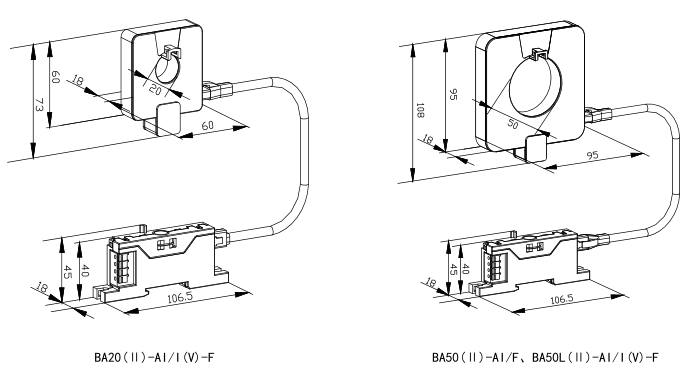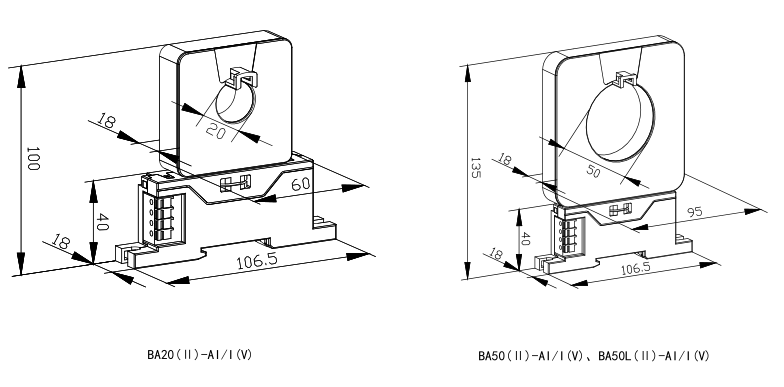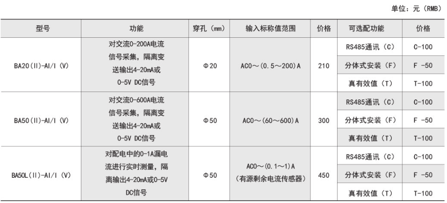 智能型BA系列電流傳感器應用電磁感應原理,對電網中的交流電流進行實時測量,采用恒流和線性補償技術,將其隔離變換為標準的直流信號輸出,或通過RS485 接口(Modbus-RTU 協議)將測量數據進行傳輸。