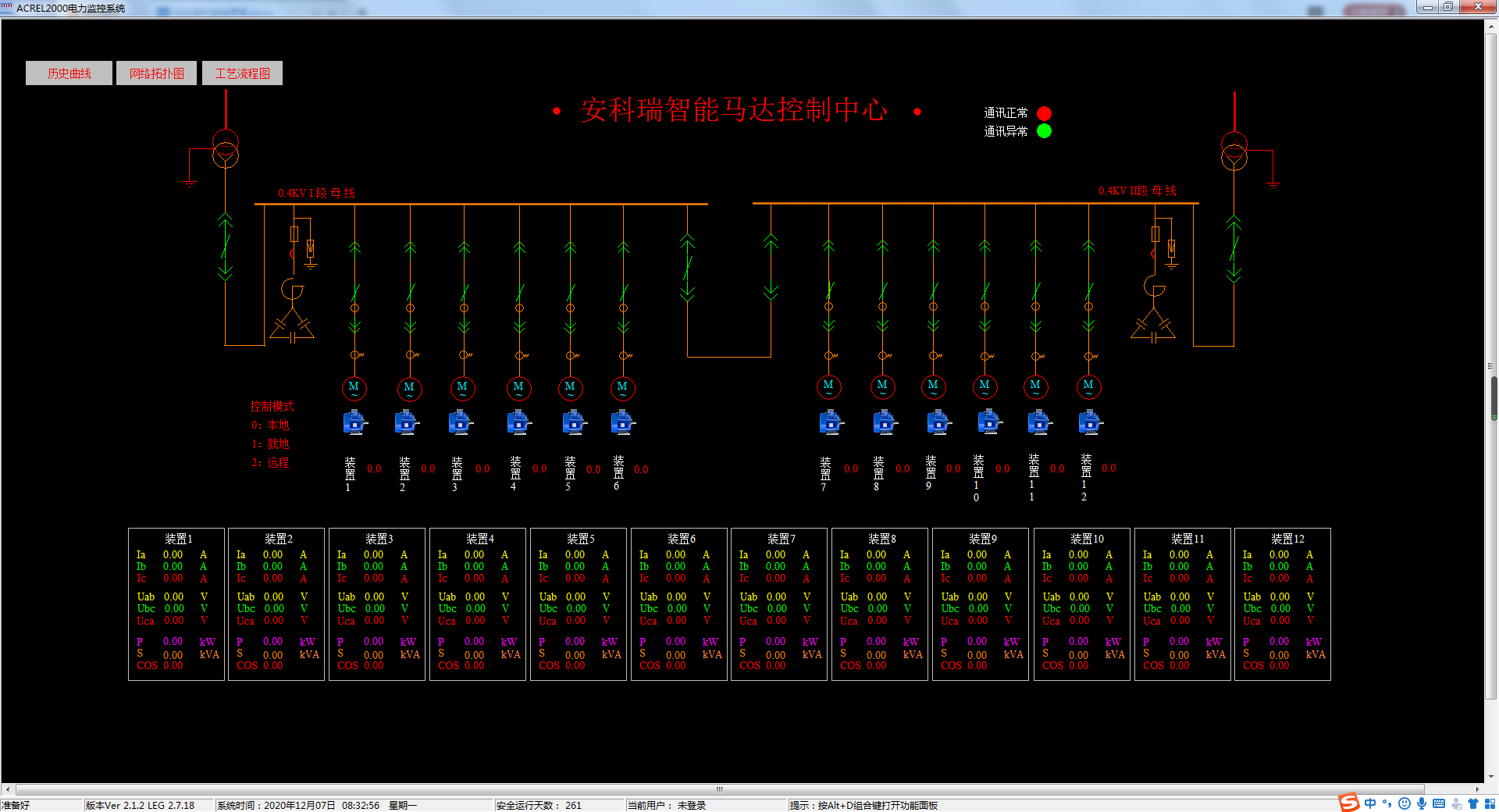以配電一次圖的形式直觀顯示電機的運行狀態(tài),實時監(jiān)測各電機、電壓、電流、功率、功率因數等電參數信息,動態(tài)監(jiān)視各電參量,有關故障、告警等信號。