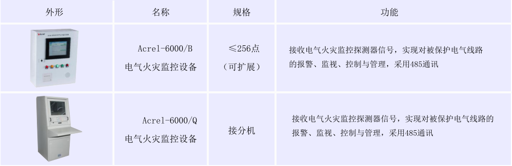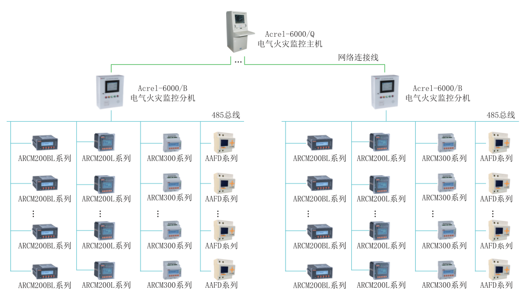 Acrel-6000電氣火災監控系統采用Acrel-6000/Q電氣火災監控設備(主機)+Acrel-6000/B電氣火災監控設備(分機)+電氣火災監控探測器三層結構組網模式,適用范圍比較廣,滿足各種環境的現場,便于區域化管理,探測器與監控設備之間采用RS-485通訊,監控設備與分機之間采用以太網通訊,滿足了通訊實時性高的要求。