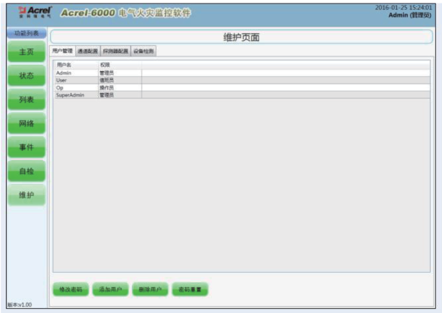 系統運行主界面 包含“登陸”、“消音”、“運行監視界面”及“系統狀態欄”四部分,可以分別通過點擊系統主界面上方的菜單欄或快速啟動欄內按鈕進入各相關功能界面。 狀態監測界面 雙擊通道可以顯示出此通道配置的監控裝置的內部設定參數、測量參數、狀態參數,并可于該界面對監控裝置進行遠程解除報警或分合閘控制。 用戶登錄界面 選擇用戶并輸入正確的密碼后,系統狀態欄會顯示當前的登錄用戶。本軟件針對的任意遠控操作均需權限登錄后方可操作,即防止無關人員誤操作。 權限管理界面 該界面可添加新的“操作員”和“值班員”權限的新用戶,也可刪除這兩個級別的現有用戶,該管理功能只有“超級管理員”和“管理員”可進行操作。 設備檢測界面 該檢測功能為“管理員”和“操作員”方可進行的操作功能,主要用于設備自檢和對監控系統柜體面板指示燈的手動檢測。 事件記錄界面 用戶于該界面內可查詢任意時段內相應報警或動作類型下的記錄,各級操作權限均可查看該界面的信息。